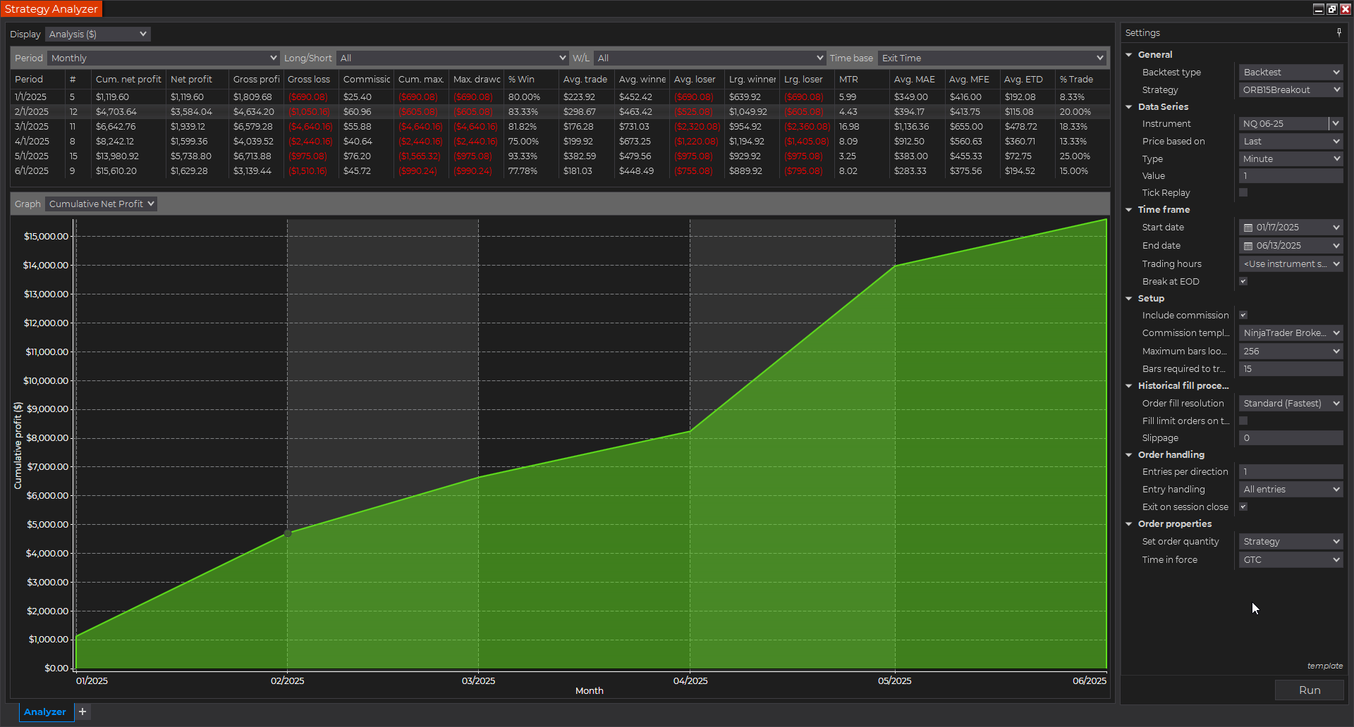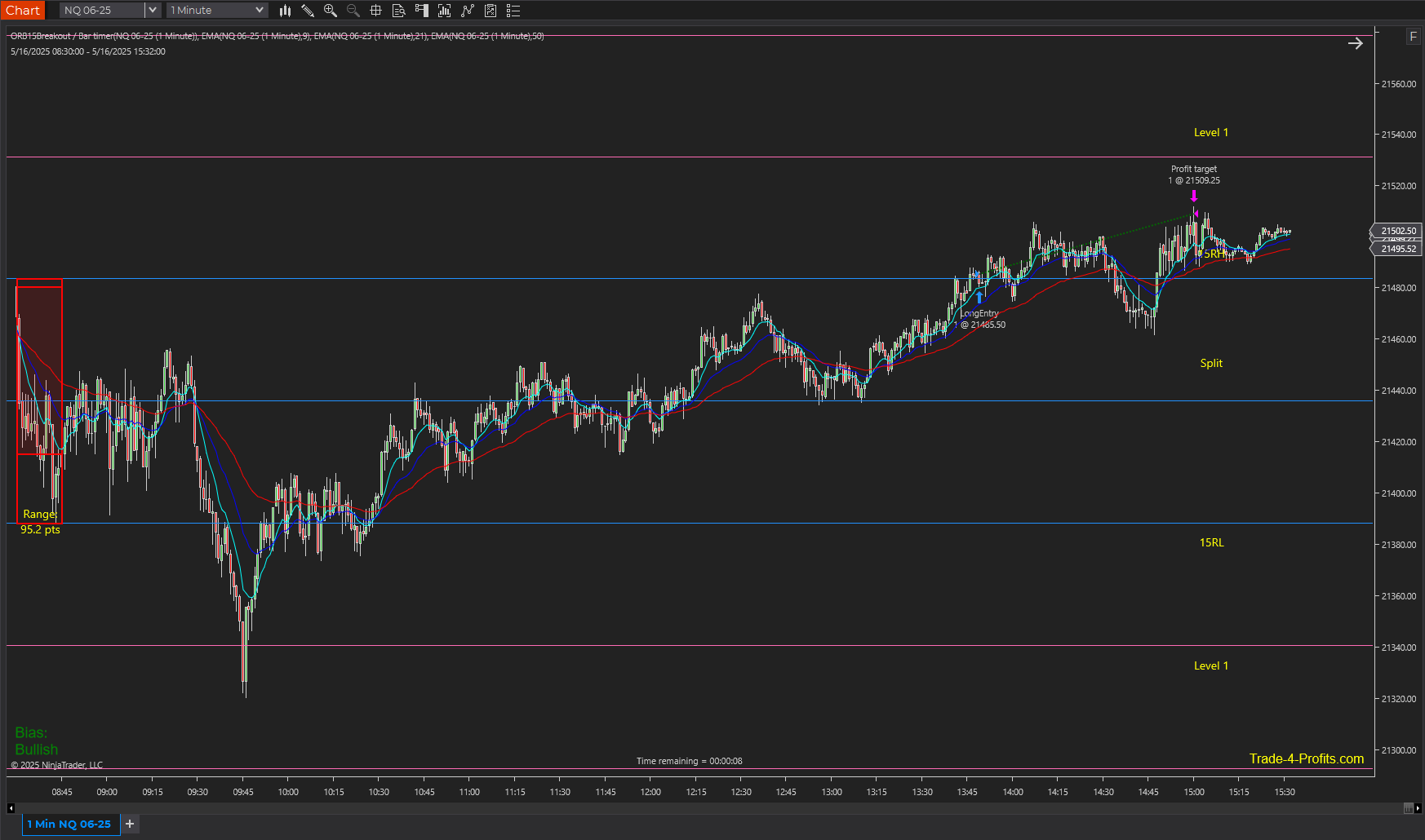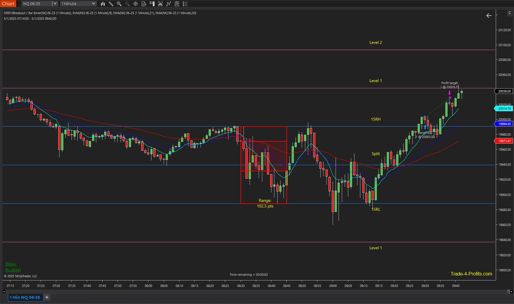 Dominate the first 15 minutes of the trading day with ORB15Breakout, a powerful algorithmic trading bot designed for Nasdaq futures (NQ & MNQ). This fully automated system is built around a proven Opening Range Breakout (ORB) model — with multi-timeframe confirmation and ultra-precise execution on the 1-minute chart.